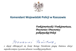 Komendant Wojewódzki Policji w Rzeszowie nadinsp. Andrzej Patrzałek, w imieniu własnym oraz kierownictwa podkarpackiej Policji, z okazji Świąt Bożego Narodzenia złożył życzenia wszystkim pracownikom i funkcjonariuszom Policji, a także policyjnym emerytom i rencistom.