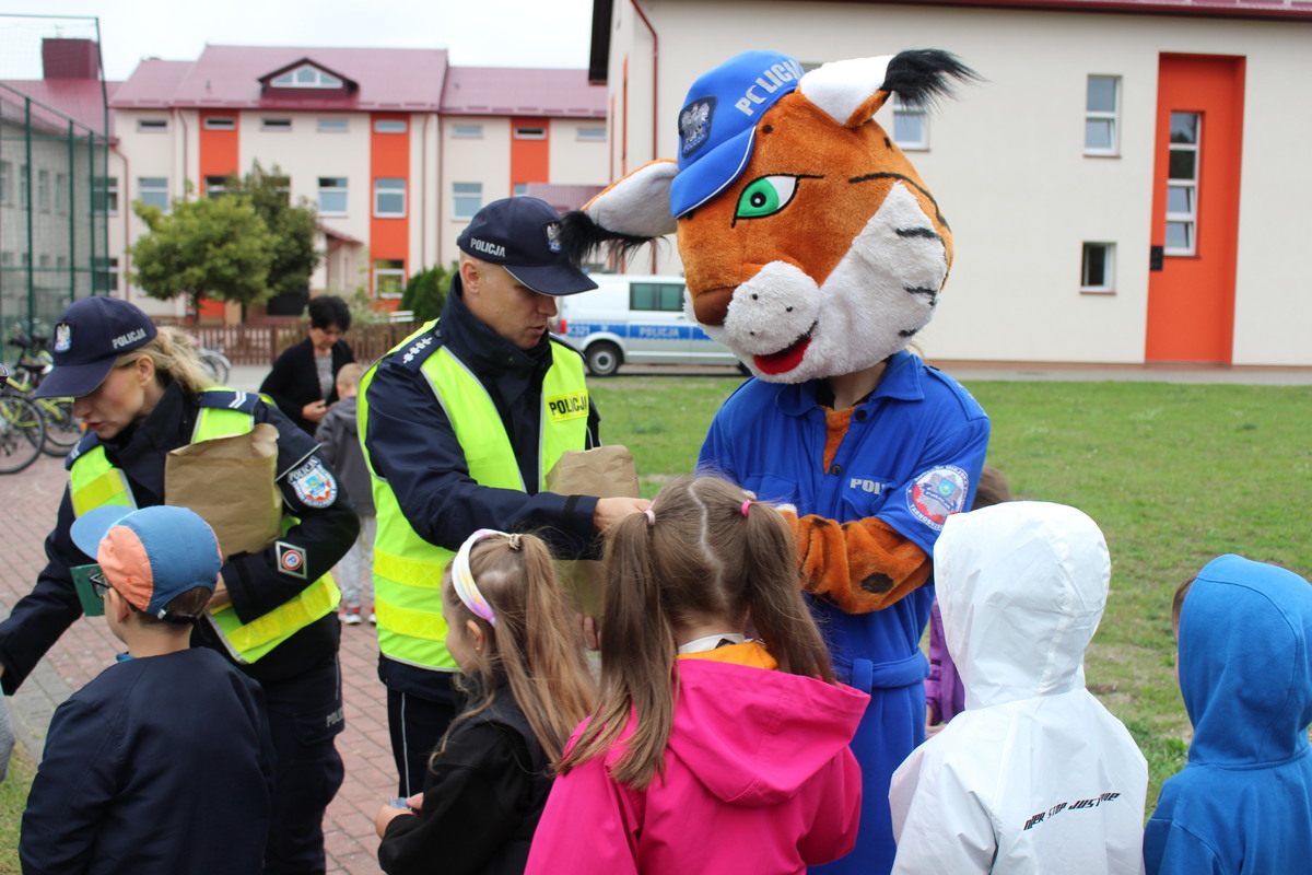 Na zakończenie spotkania dzieci wspólnie z policjantami jeszcze raz omówiły zasady bezpieczeństwa w ruchu drogowym. Mundurowi rozdali wszystkim uczestniczącym plany lekcji i odblaski. Zachęcali dzieci do noszenia elementów odblaskowych.