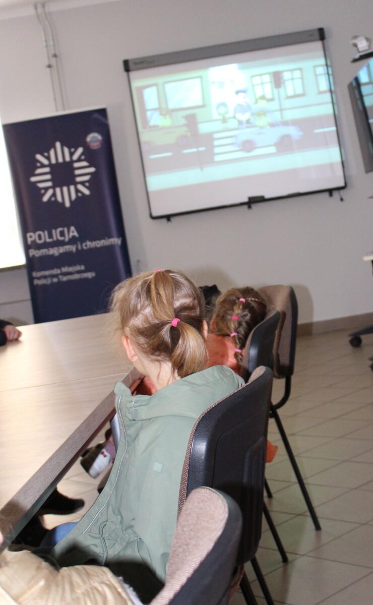 Podczas wizyty dzieci obejrzały film edukacyjny dotyczący bezpieczeństwa, dzięki któremu dowiedziały się m.in. jak prawidłowo zachowywać się na drodze, w jaki sposób unikać zagrożeń oraz kiedy należy zwrócić się o pomoc do Policji.