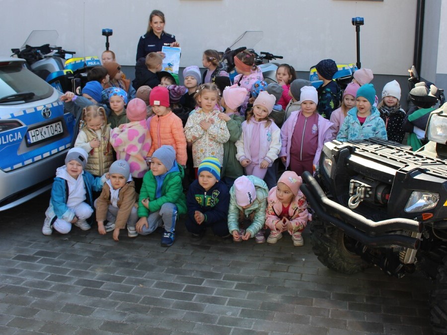 Wizyta była nie tylko ciekawą lekcją bezpieczeństwa, ale również okazją do bliższego poznania pracy policjantów. Na zakończenie spotkania dzieci podziękowały funkcjonariuszom za miłe przyjęcie i wspólnie wykonano pamiątkowe zdjęcie.