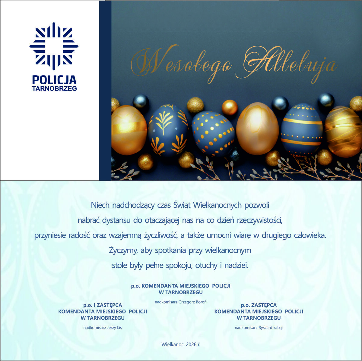 Życzenia Wielkanocne Powrót Drukuj p.o. Komendant Miejski Policji w Tarnobrzegu nadkom. Grzegorz Boroń wraz z zastępcami składa wszystkim życzenia zdrowych, pogodnych i bezpiecznych Świąt Wielkanocnych.